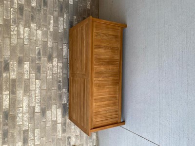 - Sturdy teak deck box doubles as an accent table when the lid is closed, offering practical surface space for drinks, décor, or serving trays in outdoor seating areas.