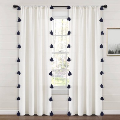 The Shilo Tab-Top Sheer features a global boho side border print and coordinating side tassels. White ground offers versatility with a pop of color. Perfect for creating a light and airy aesthetic, while adding a touch of fashion in any room of the home. Tab tops measure 3 inches and are recommended with up to a 1 inch rod for maximum movement. Curtain rod not included. Sold as a single curtain. 100% dry hand Polyester. Machine washable.