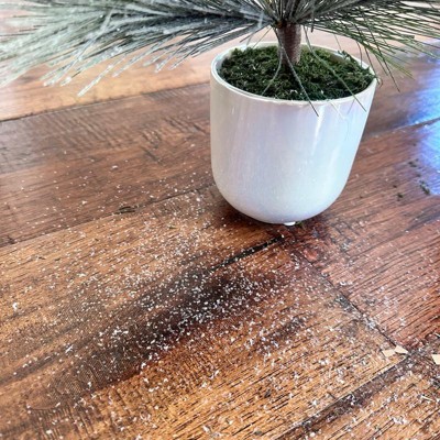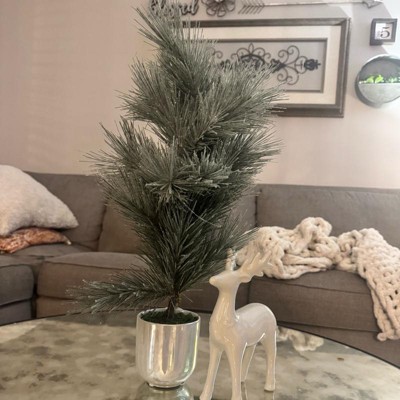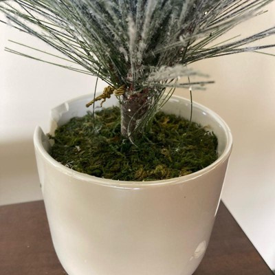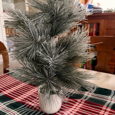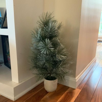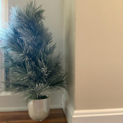 A: The tree is placed in an off-white pot, complementing its shimmer finish.