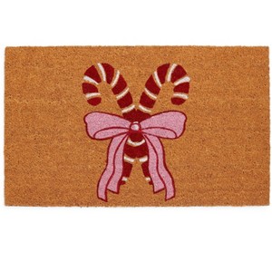 weeten up your doorstep with the Candy Cane Doormat—a festive welcome for the holiday season! Featuring two classic red-and-white candy canes tied together with a pretty pink bow, this charming design is a whimsical nod to all things merry and bright. Crafted from durable coir, it’s built to handle snowy boots and messy shoes while keeping your entryway looking cute. Perfect for adding a pop of feminine cheer to your porch, hallway, or mudroom.