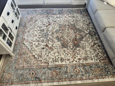 Beautiful design and colors and successful/timely delivery. It’s taking a little while for it to completely flatten out but it feels durable. However, one half of the rug is much darker and has more of a grey hue (right side in photo) while the other side has brighter colors with more of a white-washed look (left side of photo). I was able to hide the darker side under my couch though, so I would still say that I like this rug and that I would buy it again.