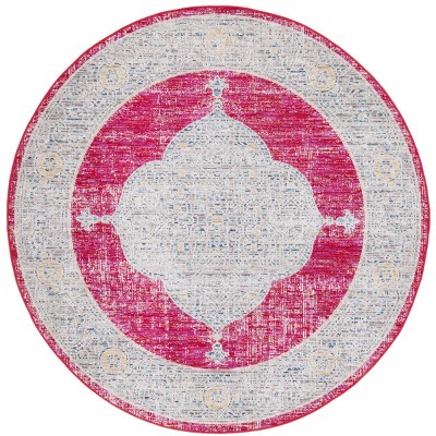 Elevate your space with the fusion of modern design and traditional charm encapsulated in our 6'-7" X 6'-7" Round area rug. Boasting a sumptuous blend of rose and grey hues, this round rug promises to be a striking centerpiece for any room. Crafted with precision on power looms, it features an intricate blend of symmetrical and ornate patterns that evoke a sense of harmony and refinement.