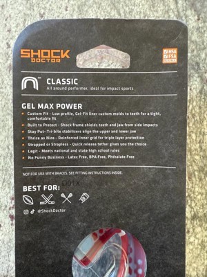 The Shock Doctor® Youth Gel Max Power Mouthguard combines high profile comfort and protection in a low-profile design. Gel Max Power features a tight, natural fit and a reinforced inner grid. IDEAL FOR MOST SPORTS - Suitable for all contact sports where a mouth guard is required or recommended including Football, Basketball, Lacrosse, Hockey, Soccer, Wrestling, Boxing, and more! Includes a detachable helmet strap for Football. Not for use with braces.