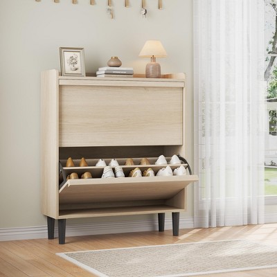 Shoe Cabinet with 2 Flip Drawers, Hidden Storage Organizer with Adjustable Shelf, Freestanding for Entryway, Hall, Living Room, Natural wood