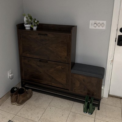 Shoe Cabinet with Bench, Farmhouse Narrow Slim Shoe Storage Cabinet 2 Flip Drawers for Entryway, Living Room, Hallway