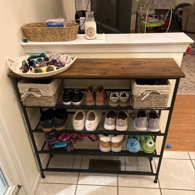 - 5-Tier Storage Rack with Wooden Top: Featuring 4 open shelves, our free standing shoe rack can store 16-20 pairs of shoes at the same time, which is perfect for your leather shoes, high heels, sneakers, slippers, sandals, etc. Besides, it also features a smooth countertop to place your bags, keys, magzines or albums. The wooden top can support up to 88 lbs, while each shelf can hold up to 44 lbs.