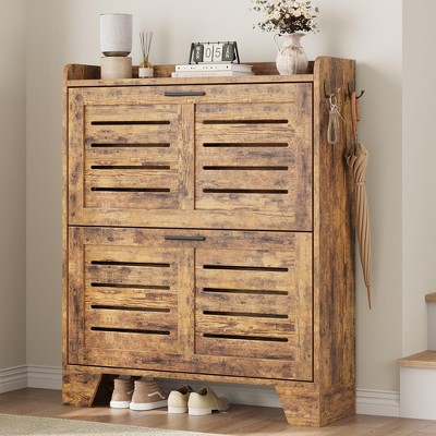 Shoe Storage Cabinet, Farmhouse Shoe Organizer with 4 Flip Drawers and Open Storage, Freestanding Narrow Shoe Rack Cabinet