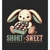 Add a sweet touch to your wardrobe with this crew neck short sleeve apparel, featuring a stuffed bunny holding a box of chocolates above playful "Short n Sweet" text in pink and green. Made from high-quality materials, this apparel offers both comfort and durability for everyday wear. Easy to care for, simply machine wash it on cold with like colors and tumble dry on low heat to maintain its vibrant design.