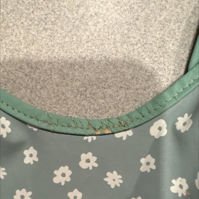 This bib is adorable and I love having the capped sleeves, but after a few months of use, the Velcro doesn’t hold anymore and the neckline is starting to peel. I only hand wash this in the sink so it really shouldn’t be form wear and tear.