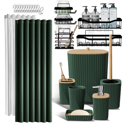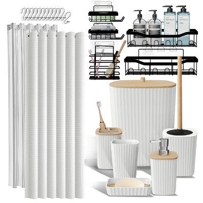 - Complete Bathroom Set Includes: 5 Piece shower caddy set, Toothbrush holder, Tumbler, Soap dispenser, Soap dish, Bathroom trash can, Toilet brush and holder set, fabric shower curtain set with clear shower curtain liner and 12 shower curtain hooks.