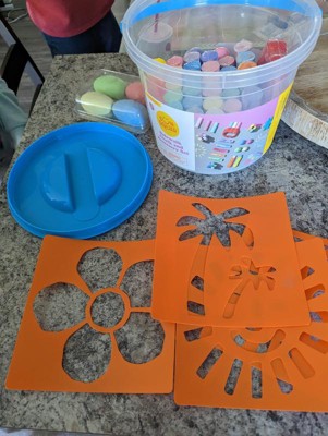 Wow, so many colors and stencils and fun with this chalk product. The chalk itself holds together well and is bold on the pavement and sidewalk. The marble chalk created well defined colors when used. All of the products in this set where nicely packaged together. As I opened the bucket, I found there was no mixing of chalk colors. The bucket can be used for multi purposes too. My children's favorite stencils where the flower and the palm trees. The stencil worked well for outlines and more of the filling needed to be colored in when the stencil was removed. The kids found it easy to use the tools in the package like the 6 mini chalk holder. The chalk did not fall out when using the device. Clean up was easy too. A splash of water was enough to get the chalk off their hands and arms, as well as their clothes. We have chalk left over too! It's great!