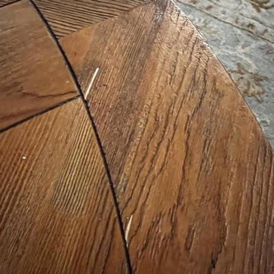 ORANGEEEEE! The table arrived in two pieces. The base is a beautiful brown color, and the top is a COMPLETELY different color….it’s orange. See the picture, however it doesn’t truly show the color difference. It also arrived with some chips and scratches. I’m not sure if I got a defective table top or what. Hopefully the manufacturer can resolve this issue.