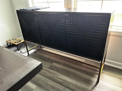 The Elinmore accent cabinet is a versatile stunner with 3 geometric patterned door fronts in warm dark brown accented with goldtone finish metal hardware. Standing on a goldtone metal open frame base, the three-door console is aesthetically contemporary and sophisticated, ready to serve as buffet, console or media cabinet.