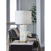 Make a grand style statement with the Signature Design by Ashley Linderfield Table Lamp. Crafted from genuine white alabaster and resin, this lamp is adorned with luxurious gold-tone metal accents, creating a glamorous centerpiece for any room. The natural beauty of alabaster ensures each piece offers unique character, while the drum hardback fabric shade brings a modern touch. Featuring a convenient 3-way switch and integrated LED nightlight, this 29.25" lamp suits end tables or flanking a sofa with timeless appeal and practical illumination.