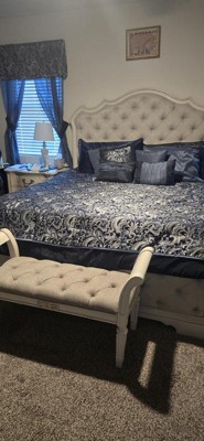 It was an excellent addition to my bedroom. Very sturdy and the vintage worn wood details are perfect! Assembly was easier than I expected but I was surprised that the fabric is more of a grey-blue and not grey, luckily I purchased it to go with the raelyn bedroom set. For those that are looking for a true grey...you might be disappointed with the color. Fabric is a linen pattern with stitches of grey, dark blue and off white. It is beautiful