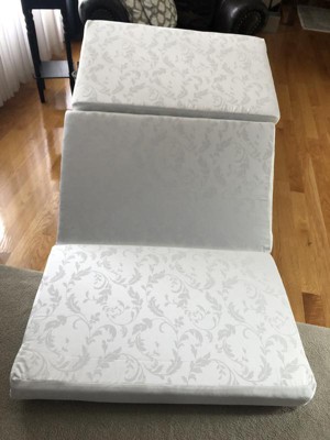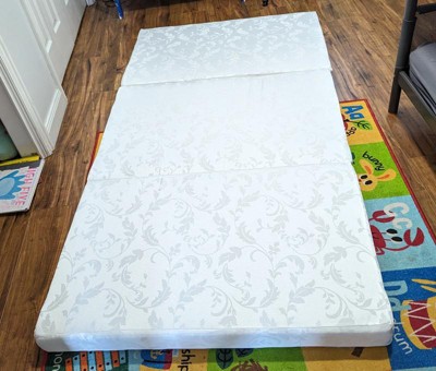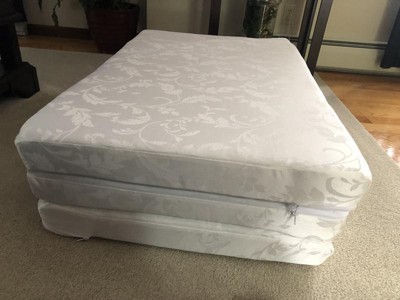 [This review was collected as part of a promotion.] Love this trifold mattress! Twin size folds up into 3 sections and becomes compact in its own carrying case for easy storage. It comes with a nice, silk-like cover as well as the carrying bag. The mattress has a very firm feel to it. So convenient to store! Recommended.