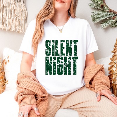 Embrace the peace and serenity of the holiday season with our 'Silent Night Block Distressed' design. This vintage-inspired print features a timeless message in a distressed block font, giving it a retro feel that is perfect for winter celebrations. The muted colors and simple design evoke a sense of coziness and nostalgia, making it a perfect addition to your holiday wardrobe. Whether you're cuddled up by the fire or out enjoying the festive lights, this design will bring a touch of warmth and cheer to your look. -
