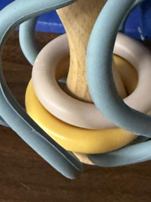 A: The rattle toy is made from silicone, ABS, and beechwood.