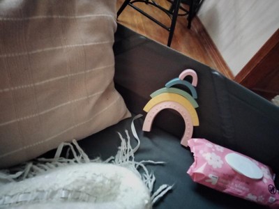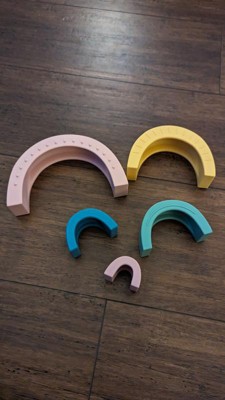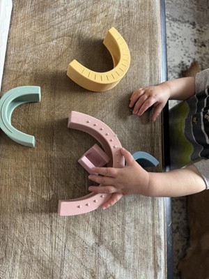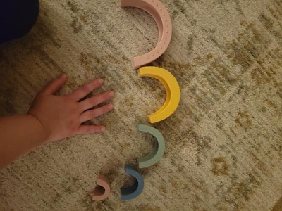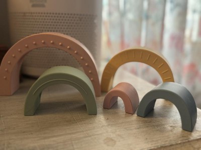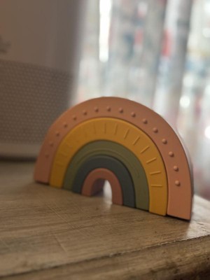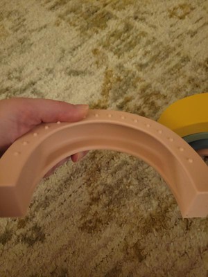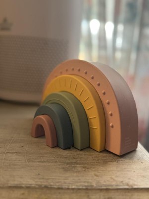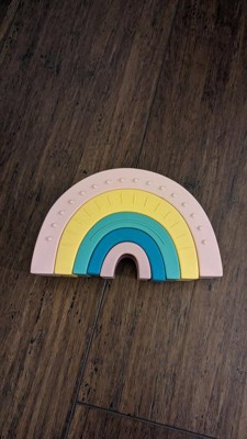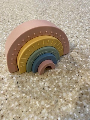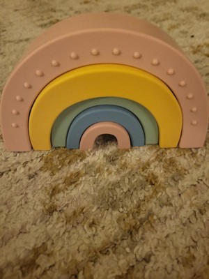 This rainbow stacker is a cute toy for toddlers. It is made of soft silicone that is easy on little hands. It is easy to clean. The colors are soft and the pieces fit together nicely. My little one loves playing with it.