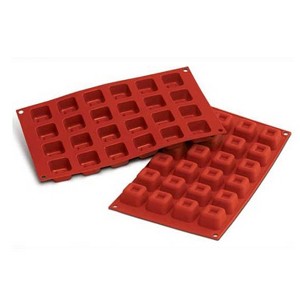 Flexible silicone baking pans work well with baked and frozen desserts, but they are also great for baked and chilled savory dishes, too. This Silikomart Silicone Square Savarin Mold is perfect for canapés or chilled appetizers. High quality food-safe silicone makes this pan naturally non-stick, and resistant to any residual odors or tastes left over from other foods. Durable and flexible, Silikomart pans promise to last for years of use, and will never crack or chip. Simply bend and fold for easy storage, molds will always retain their original shape.