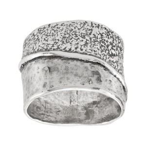 This wide silver band plays with contrast and flow, featuring a fluid ridge that sweeps across its surface. Its design gives it a sculptural, modern feel, while the rich texture adds visual depth and light interplay. Distinct yet versatile, this ring makes a wonderful addition to any collection. Consider ordering one size up, as the wide nature of this ring may cause it to fit snugly. The piece comes with a “.925” sterling silver quality stamp. Nickel-free and hypoallergenic, this style comes beautifully presented in signature packaging.