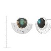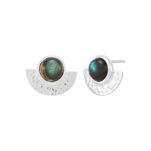 These sterling silver earrings feature mesmerizing 8mm labradorite stones. The half-round shapes encircling the dark stones enhance their visual allure. The hammered texture enriches the aesthetic of the earrings. Designed for effortless elegance, they bring a hint of mystery to any look. The pieces come with ".925" sterling silver quality stamps. Nickel-free and hypoallergenic, this style comes beautifully presented in signature packaging.