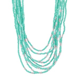 Designed to stand out without overpowering, this multi-strand necklace flatters the neckline. Rows of teal and metallic silver seed beads drape effortlessly, offering a soft and subtle texture. Pair this with the Tranquil Cascade Bracelet and the Tranquil Cascade Earrings. The piece comes with a “.925" sterling silver quality stamp. Nickel-free and hypoallergenic, this style comes beautifully presented in signature packaging.
