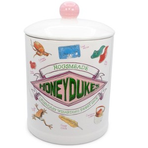 Store your chocolate frogs, fizzing whizbees, and other favorite candies in this matching snack jar straight from the Wizarding World! Inspired by the beloved Harry Potter series of books and movies, this jar features a front design of the logo of famed Hogsmeade confectionary, Honeydukes, surrounded by a couple of wizard and witch favorite sweets. A great piece to add a touch of magic and sorcery to your decor!
