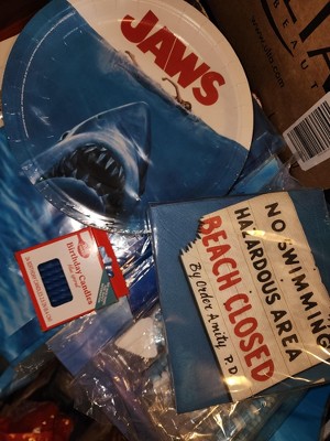 - JAWS PARTY PACK: Movie fanatics will love this iconic Stephen Spielberg Jaws party set. Plates, cups and napkins are designed with an ocean blue background and feature the iconic movie image on the front.