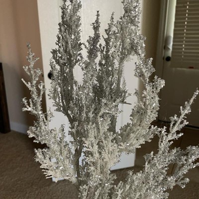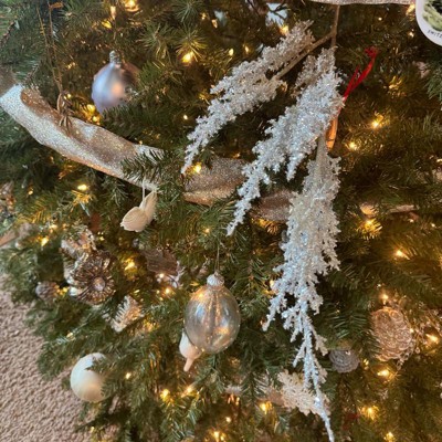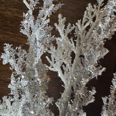 [This review was collected as part of a promotion.] I bought these silver cypress stems as a spray for our Christmas tree. They actually come with two stems wrapped tightly together but you can easily separate them for two separate stems if you’d like, which is what I did. They look pretty from far away but up close there are spots of bare plastic and the glitter pieces are randomly clumped together. It’s overall poor quality and I know the glitter would continue to come off over time until they were just bare plastic stems. I’m disappointed because they looked perfect for what I needed online.