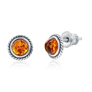 Product Name: Sterling Silver, Round Amber, Designed Outline Studs amber, natural stone, textured, oxidized, earrings, round