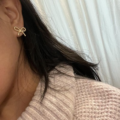 A: The earrings feature a cutout bow shape with a ridged design for a playful yet polished look.