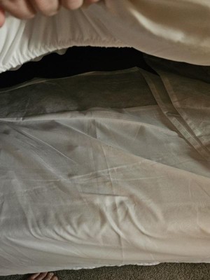 Q: I am interested in the white bed skirt but wanted to know how sheer is the fabric in white? My box spring is tan and I don't want it to show through. Let me know. Thanks!