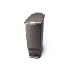 This slim plastic step can has a space-efficient shape that fits perfectly in tight spaces, like between cabinets. The strong steel pedal is designed to last, and the patented lid shox technology ensures a smooth, silent close every time. A slide lock helps keep trash in and pets and curious children out. The code K liner fits this can perfectly — no bunching or slipping for a cleaner trash experience.
