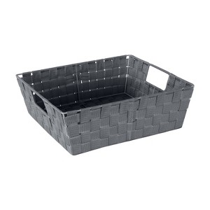 This Simplify woven strap bin is made of sturdy polypropylene with epoxy wire frame dual handles for easy carrying. Acts as a great storage accessory for all your home needs. Maintenance free. This woven storage basket is great for bath and beauty products, toys, school supplies, magazines and more. Versatile design and features to organize any space in your home, dorm room or office.
