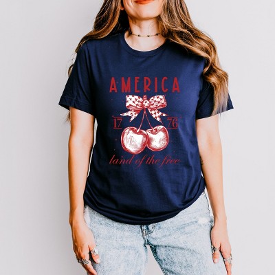 Celebrate the sweet taste of summer with our America Cherries Stripe design. This vibrant and patriotic print features juicy cherries scattered in between subtle blue stripes. If you're looking to show off your love for the USA, the America Cherries Stripe design is sure to bring a touch of fun and festive flair wherever you go. Introducing our Unisex Short Sleeve Tee, crafted from soft, high-quality materials for a comfortable fit. Featuring a trendy graphic design, this tee is perfect for adding a stylish touch to any outfit.