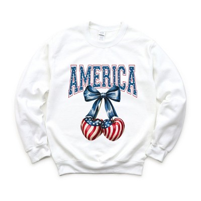 The 'America Flag Cherries Coquette' design is a charming and patriotic print that features a combination of the American flag and sweet cherries. This design exudes a vintage and feminine vibe, making it perfect for those who love a touch of retro style. Whether you're celebrating Independence Day or just want to show off your patriotic spirit, this design is sure to make a statement. Add a touch of summer flair to your wardrobe with this unique print-on-demand design. Stay cozy and stylish in this Adult fit, soft and comfortable sweatshirt. Featuring a high-quality graphic design, this trendy piece is perfect for any casual occasion. Size up for an oversized look.