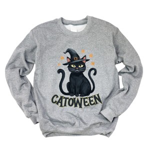 Embrace the spooky season with this Catoween Cat print. The design features a mysterious black cat with glowing eyes. Perfect for anyone who loves all things Halloween, this design will add a touch of magic to your fall wardrobe. Whether you're attending a Halloween party or just love the festive season, this design is sure to impress. Get into the spirit of trick-or-treating and embrace the haunted vibes with this Halloween Cat print on your favorite products. Stay cozy and stylish in this Adult fit, soft and comfortable sweatshirt. Featuring a high-quality graphic design, this trendy piece is perfect for any casual occasion. Size up for an oversized look.