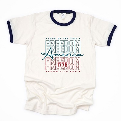 The 'Freedom Stacked' design is a bold and unique representation of the concept of freedom and independence. Whether you're a proud patriot or simply appreciate eye-catching designs, this print on demand design is sure to turn heads. With its dynamic and versatile nature, this design can be printed on a variety of products to showcase your love for freedom in a stylish way. Elevate your wardrobe with our vintage-inspired Ringer Tee. This trendy high-end graphic tee features a soft feel, ribbed binding on the neckline and sleeves for added style.