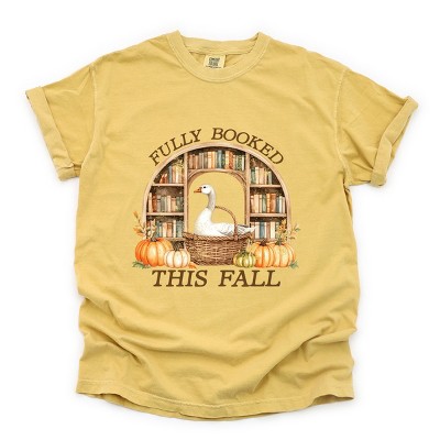 Embrace the cozy vibes of autumn with our 'Fully Booked This Fall' design. Perfect for all the bookworms and literature lovers out there, this design features a stack of books surrounded by pumpkins and a warm, inviting color palette. Whether you're a part of a book club or simply enjoy getting lost in a good book, this design is a must-have for the season. Snuggle up with your favorite read and show off your love for all things autumn with this stylish and trendy print-on-demand design. Introducing our trendy Garment Dyed Tee. Adult fit with a vintage feel that improves with wear. Made from high-quality materials and featuring a unique print. Upgrade your wardrobe with this timeless piece.