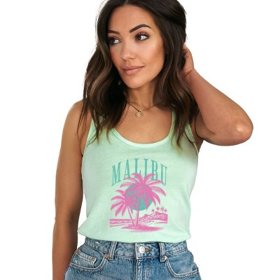 Stay trendy all summer long with our women's fitted racerback tank. Perfect for everyday wear, this tank features a stylish curved hem and a graphic print. Embrace the heat in style with this must-have piece for the season.