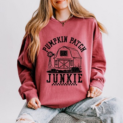 Embrace your love for the autumn season with this whimsical 'Pumpkin Patch Junkie Barn' design. Featuring a charming barn surrounded by pumpkins, this design is perfect for anyone who can't get enough of pumpkin patches and fall festivities. Whether you're a pumpkin spice fanatic or just enjoy the cozy vibes of autumn, this design is sure to bring a touch of seasonal charm to your wardrobe. Stay cozy and stylish in this Adult fit, soft and comfortable sweatshirt. Featuring a high-quality graphic design, this trendy piece is perfect for any casual occasion. Size up for an oversized look.