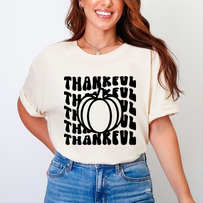 Celebrate the season of gratitude with this charming design featuring the word 'Thankful' stacked with a pumpkin in the middle. The whimsical design is perfect for adding a festive touch to your fall wardrobe or as a thoughtful gift for friends and family. The vibrant colors and playful illustration make this design a fun and stylish addition to any collection. Introducing our Adult Fit Short Sleeve Tee, crafted from soft, high-quality materials for a comfortable fit. Featuring a trendy graphic design, this tee is perfect for adding a stylish touch to any outfit.