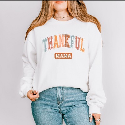 Celebrate motherhood with this stylish and trendy Varsity Thankful Mama design. Show off your gratitude and love for being a mom with this eye-catching print. The bold varsity lettering adds a sporty and modern touch to this design, making it perfect for any fashionable mama out there. Whether you're running errands or just relaxing at home, this design will remind you of all the reasons to be thankful. Available in a variety of colors to suit your personal style. Stay cozy and stylish in this unisex fit, soft and comfortable sweatshirt. Featuring a high-quality graphic design, this trendy piece is perfect for any casual occasion. Size up for an oversized look.