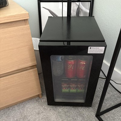 - IDEAL BEVERAGE COOLER: 14.8"D x 11."W x 16.8"H mini fridge can keep a variety of canned drinks or wine chilled without taking up too much space at your home, dorm, bar or office. It can conveniently hold 24 standard-sized drink cans .