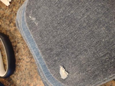 The jean patches are stapled together!! It was tedious and took a while to get them apart and they have holes in them! Otherwise they were very easy to apply and seem to hold up so far. I didn't even notice they came with full size fabric scissors - that was a nice surprise!