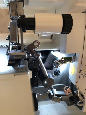 [This review was collected as part of a promotion.] This is a very nice serger. The first thing I noticed right out of the box is it has a handle on top. Previous sergers I have owned did not have this. It may not sound like a big deal, but for someone like me who works in a small space a carrying handle makes a huge difference when moving things around. The bottom of the machine has feet that form suction cups and hold the machine in place against a table. When I pulled my machine out of the box, it had some oil or grease on the bottom. Not a big deal and easy to clean off. I’m assuming it was probably oiled not long before shipping. My serger came already threaded, so I was able to tie my new thread on easily. The front opening is lighted which is very helpful when threading. I like that you have the option to use 2, 3, or 4 threads and there are various stitch styles and widths depending on your project. Another nice feature is this serger has an extension that comes off, so you have a free arm to sew smaller items and difficult areas like armholes. The accessories (extra needles and screwdriver) were inside the extension when I pulled it off. There are also tweezers located inside the front cover. I started by sewing on some scrap fabric. I did have to adjust the tension a little but once I got the right setting I got a very nice clean edge. My first project was making my own ribbon to put on a birthday present, and it came out very nice! The one issue I do have is the manual doesn’t quite match up with my machine. According to the manual, both the stitch length dial and the differential feed should both be set to “N” for most sewing. “N” is not an option on either of those dials. I’m making note of what the dials were set to out of the box and I’ll probably just experiment on scrap fabric to determine the correct settings for certain stitches/fabrics. Overall, this a great serger and I think I’ll be using it for a long time.