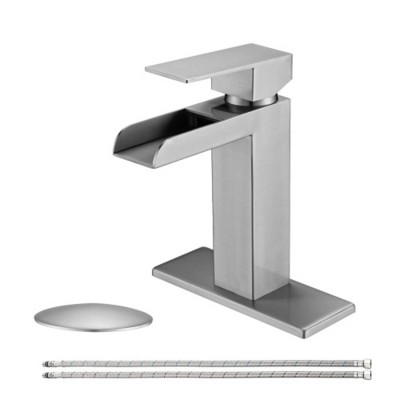 This wall-mounted, single-handle faucet boasts a smooth brushed nickel exterior, offering a contemporary and rust-resistant addition to your bathroom. Its waterfall spout delivers a calming, stylish water flow for a serene washing experience. The matching pop-up drain included streamlines installation, while the versatile deck plate accommodates one to three-hole setups for a polished and expert bathroom finish.