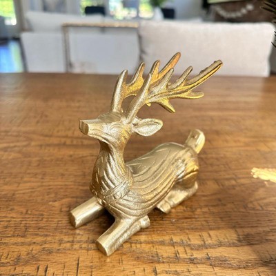 Make your Christmas decor shine with this Sitting Metal Deer from Threshold™. Made of metal, this sitting deer figurine is designed in a gold-tone finish that beautifully reflects the light for a glam touch. Featuring sparkly antlers, this 5.25-inch deer is ideal for placing on a tabletop, mantel or entryway table with other festive figurines.