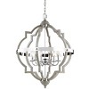 The Socorro six light indoor pendant in washed pine is the perfect way to achieve your desired fashion or functional needs in your home. The transitional Socorro lighting series by features a classic, barbed Quatrefoil profile - wholly updated by combining a distressed Cerused Oak finish on the decorative silhouette with the rich Stardust finish on the metal bobeches and decorative strapping to create undeniable rustic charm. While still offered in its original finish Stardust, the Socorro has been beautifully updated with our popular Washed Pine and Chrome finish to offer a modern take on this timeless industrial beauty. The collection includes a four-light mini-chandelier, medium and large six-light chandeliers, and four-light and six-light hall / foyer pendants. Incandescent candelabra base lamping.